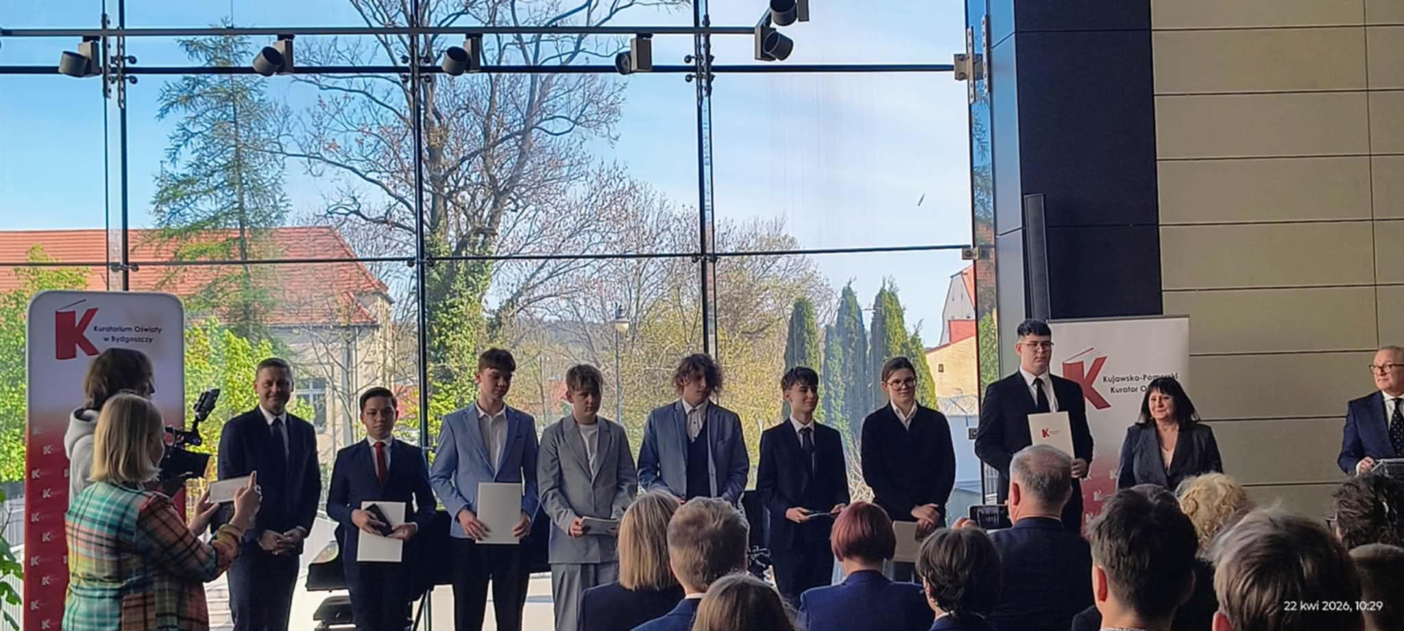 Szymon Szczesiak i Jakub Łasiński odebrali dziś dyplomy , zaświadczenia i gratulacje podczas uroczystej gali laureatów konkursów przedmiotowych organizowanej przez Kujawsko-Pomorskiego Kuratora Oświaty.