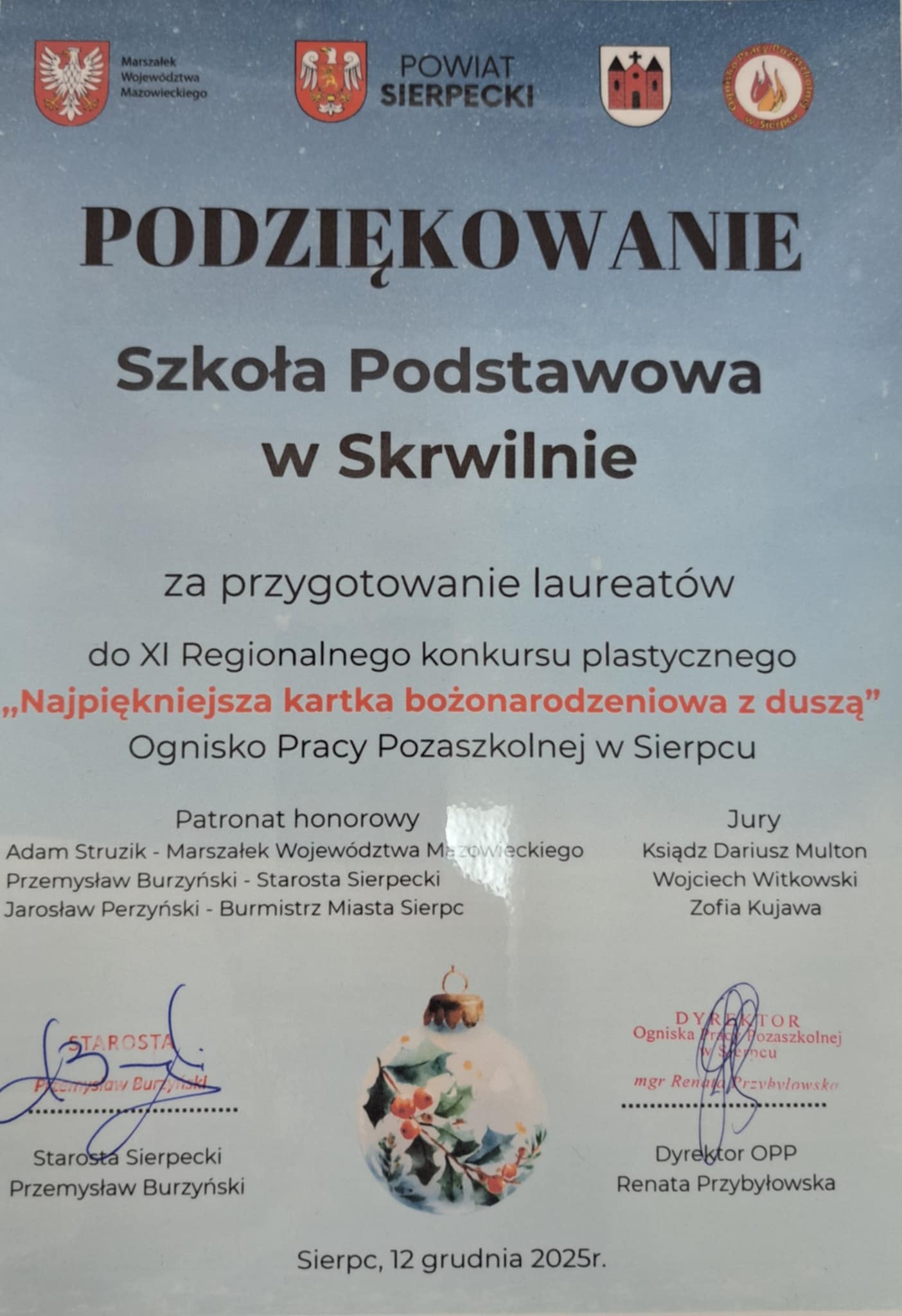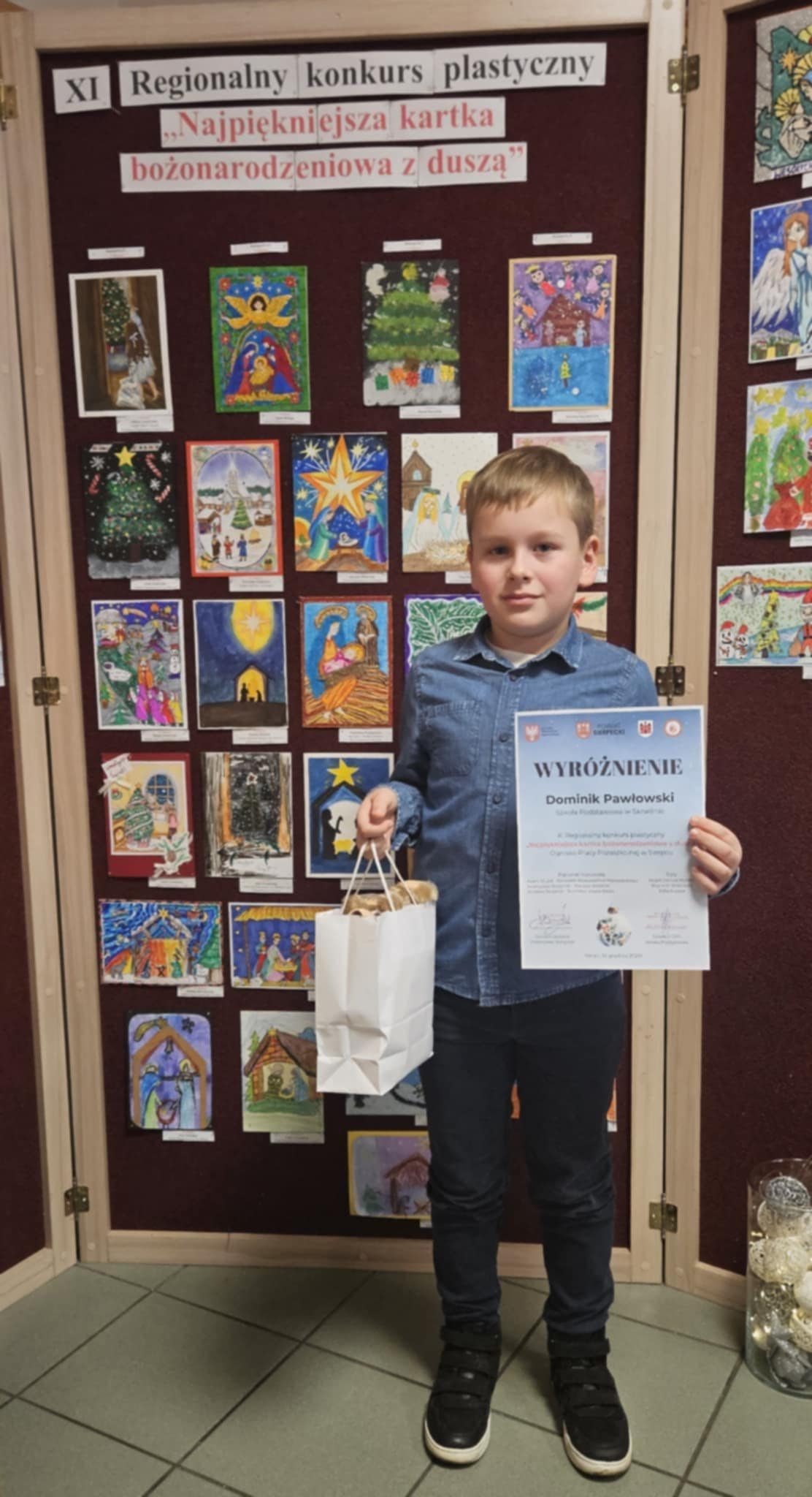 Uczniowie naszej szkoły wzięli udział w konkursie plastycznym organizowanym przez Ognisko Pracy Pozaszkolnej w Sierpcu na „Najpiękniejsza kartkę bożonarodzeniową z duszą”. Zadaniem każdego dziecka było samodzielne wykonanie kartki świątecznej. Prace zaskoczyły wszystkich, a uczniowie wykazali się ogromną kreatywnością. W piątek 12 grudnia nastąpiło rozstrzygnięcie konkursu i wręczenie nagród zwycięzcom. Wśród nich znalazł się uczeń naszej szkoły Dominik Pawłowski z klasy Ia, który otrzymał wyróżnienie.