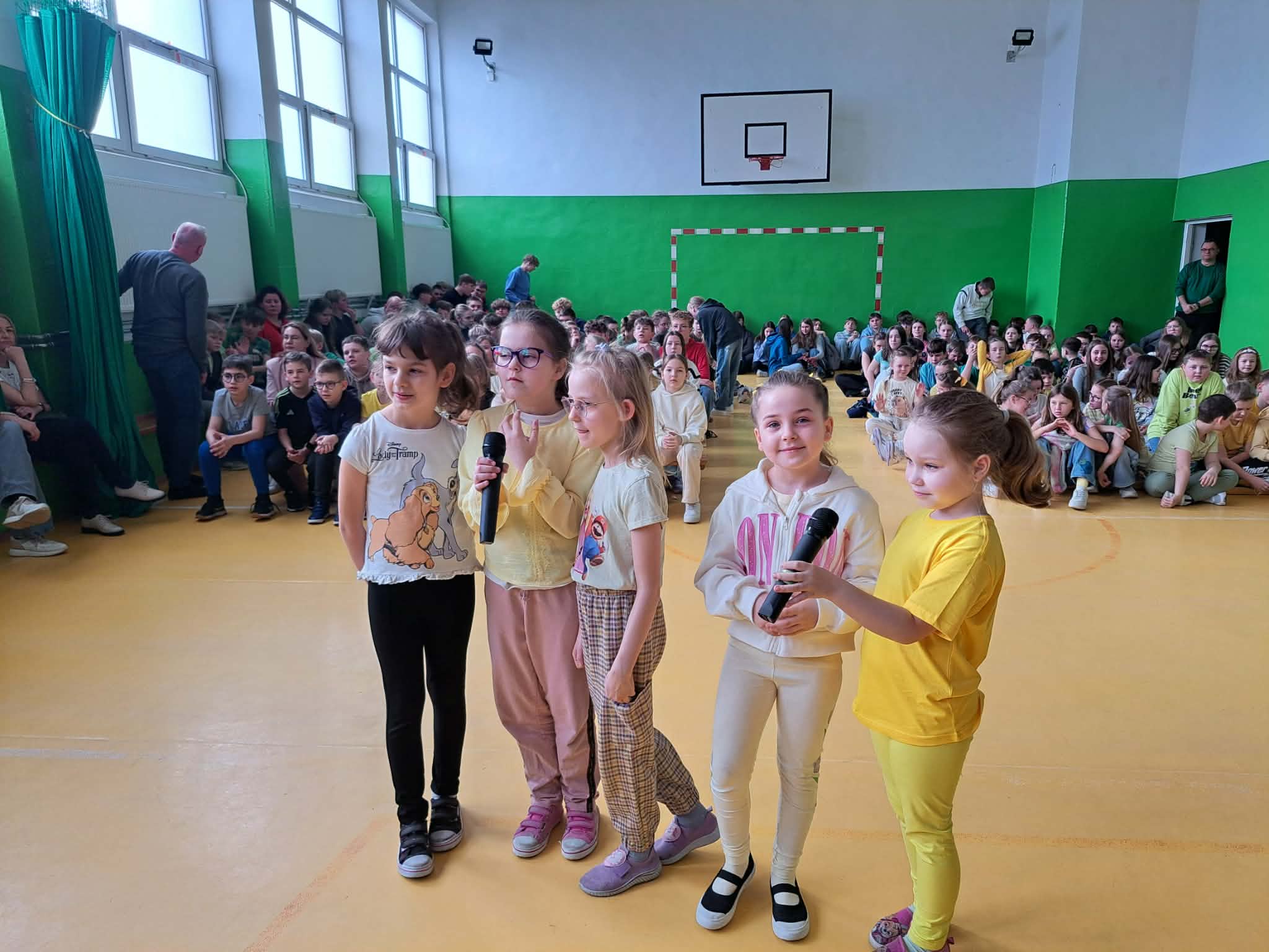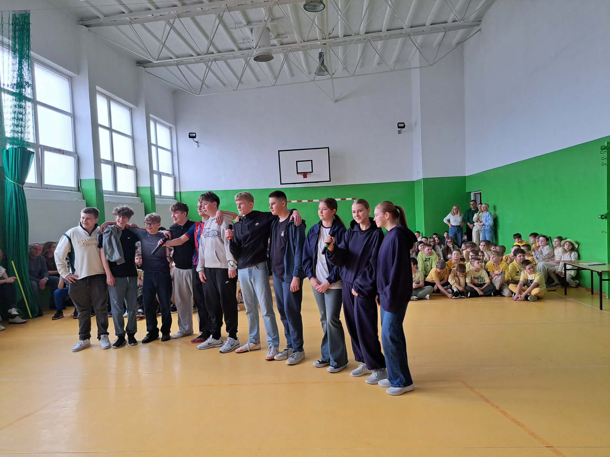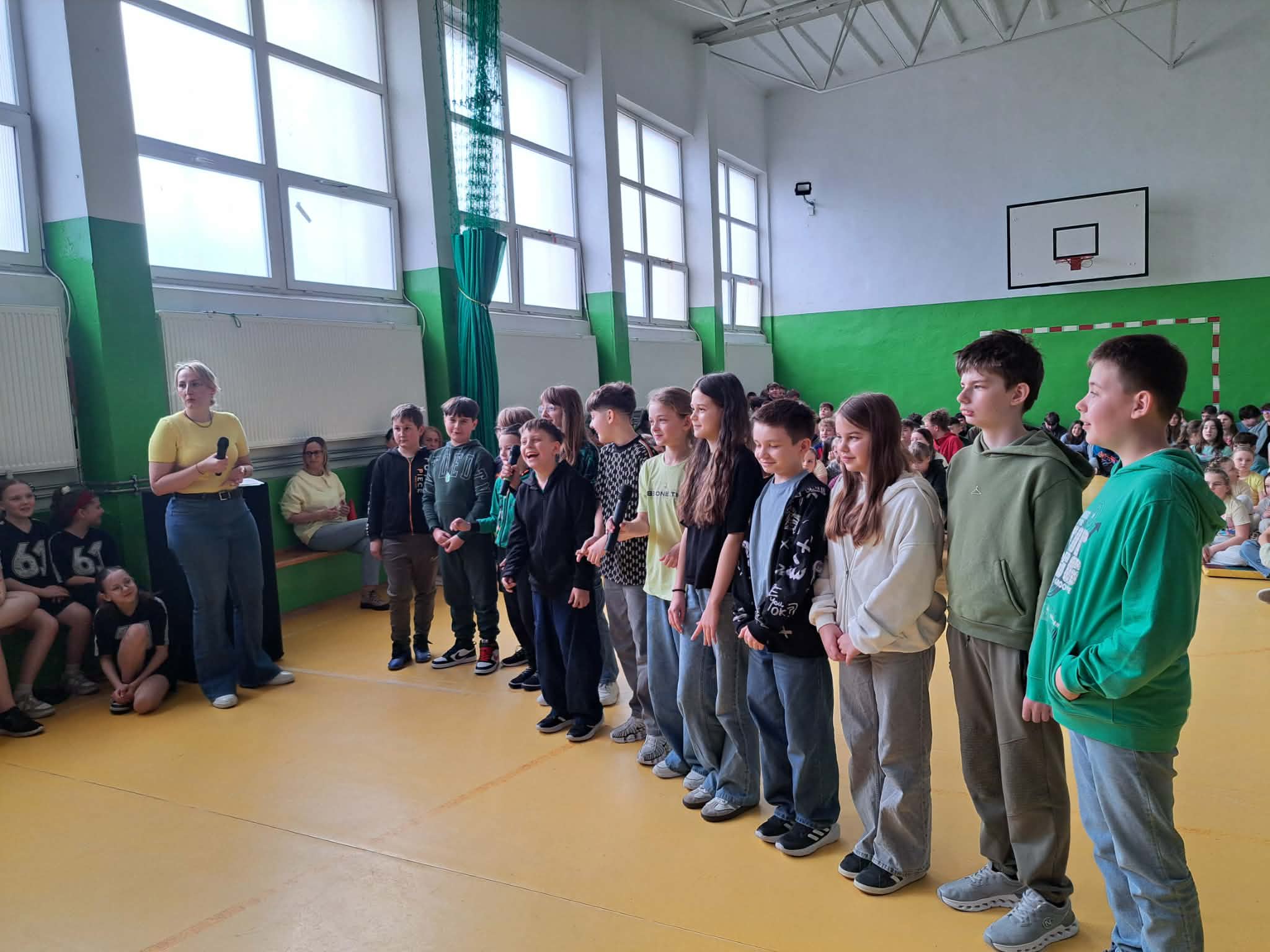 Kolejnym punktem programu było szkolne karaoke. Uczniowie bardzo chętnie prezentowali swoje umiejętności wokalne, a wspólne śpiewanie znanych piosenek przyniosło wszystkim wiele radości i dobrej zabawy. Do zabawy włączyli się również nauczyciele, którzy jako grupa wystąpili na scenie prezentując swoje wokalne talenty i pokazując, że wspólna zabawa łączy całą społeczność szkolną.