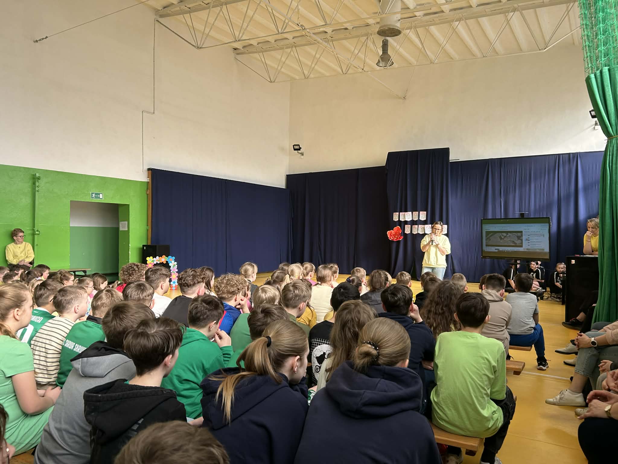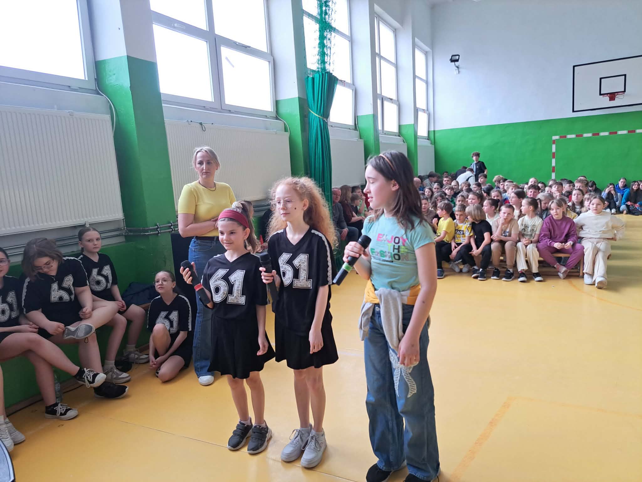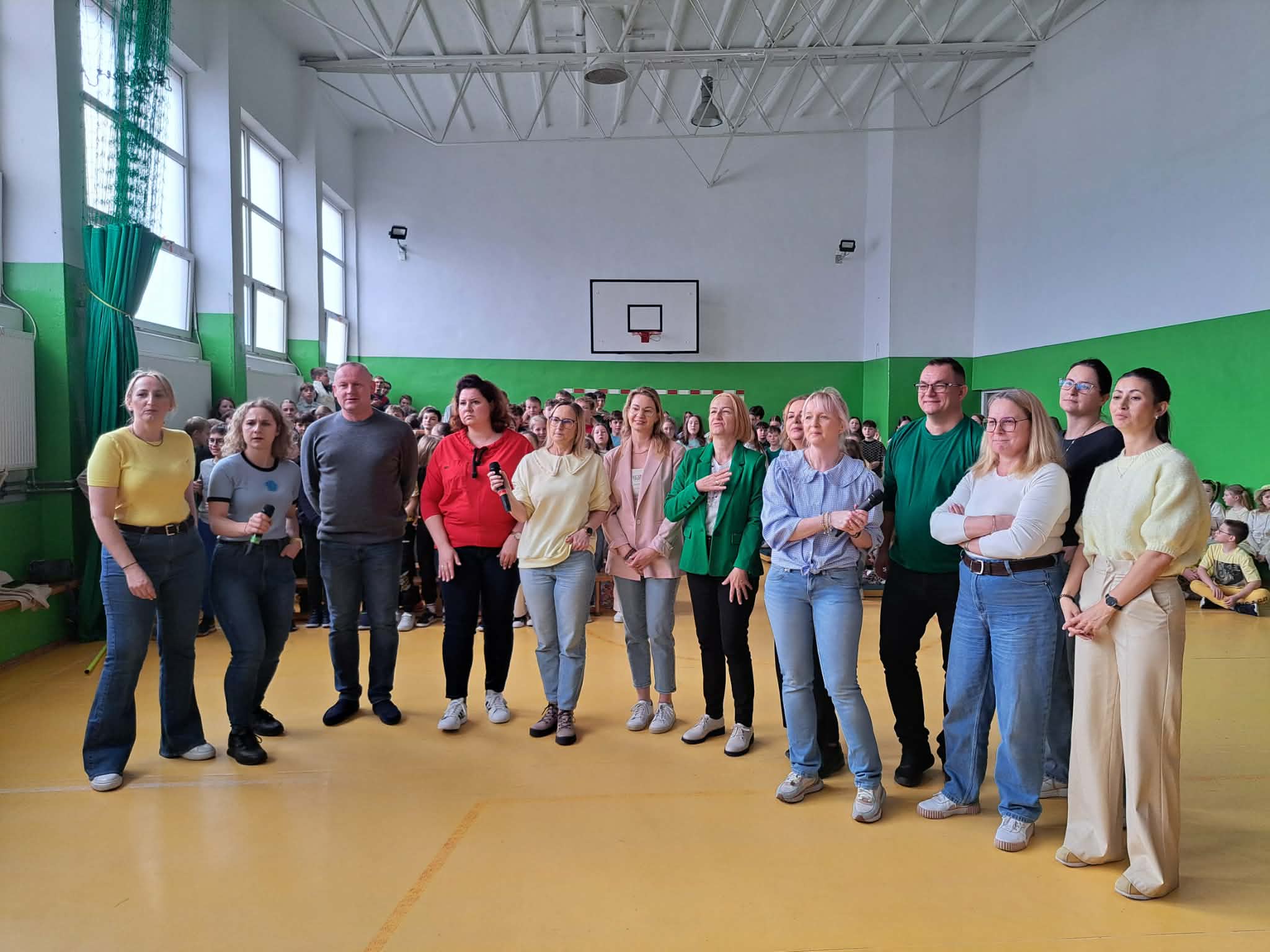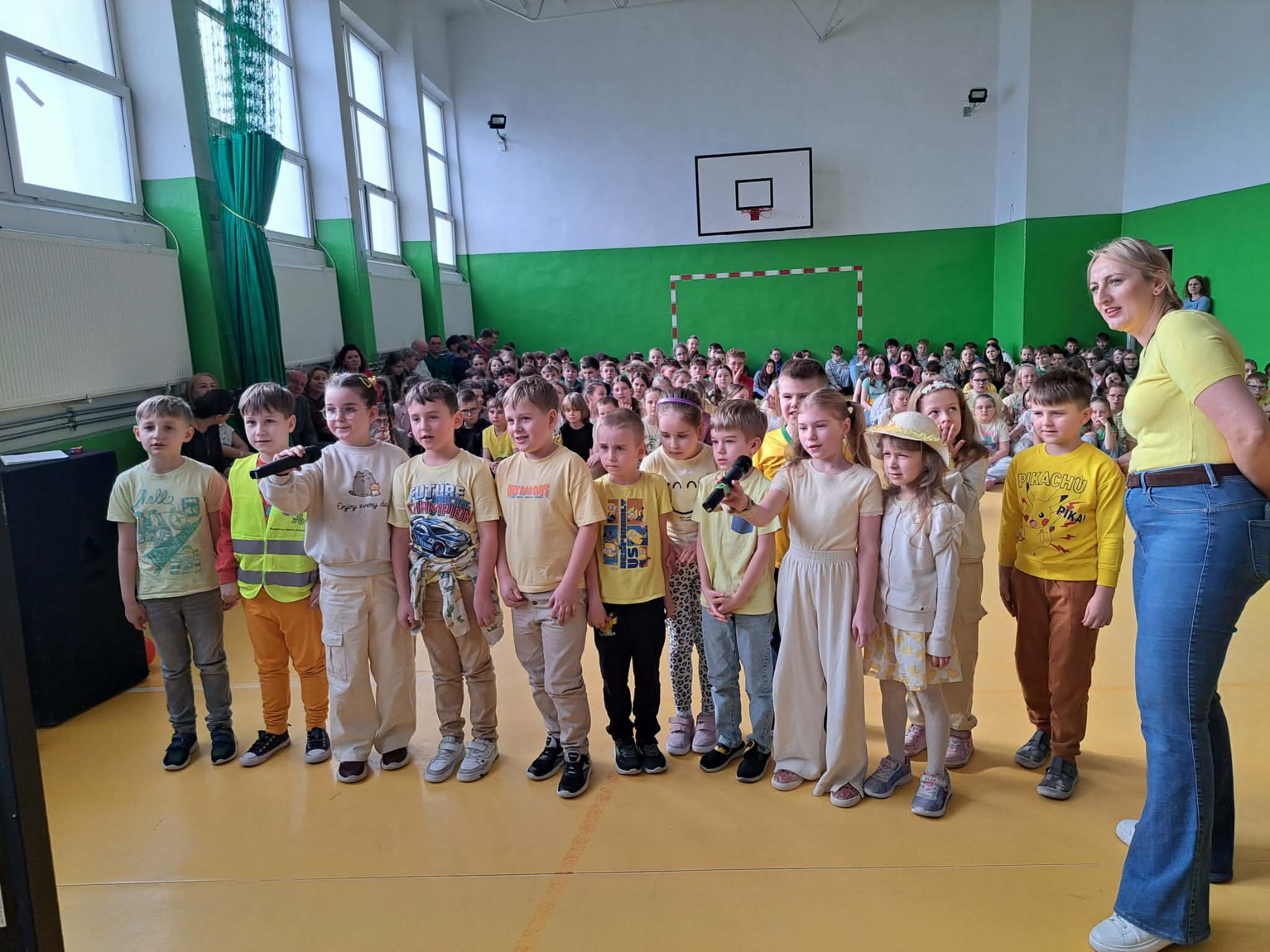 Kolejnym punktem programu było szkolne karaoke. Uczniowie bardzo chętnie prezentowali swoje umiejętności wokalne, a wspólne śpiewanie znanych piosenek przyniosło wszystkim wiele radości i dobrej zabawy. Do zabawy włączyli się również nauczyciele, którzy jako grupa wystąpili na scenie prezentując swoje wokalne talenty i pokazując, że wspólna zabawa łączy całą społeczność szkolną.