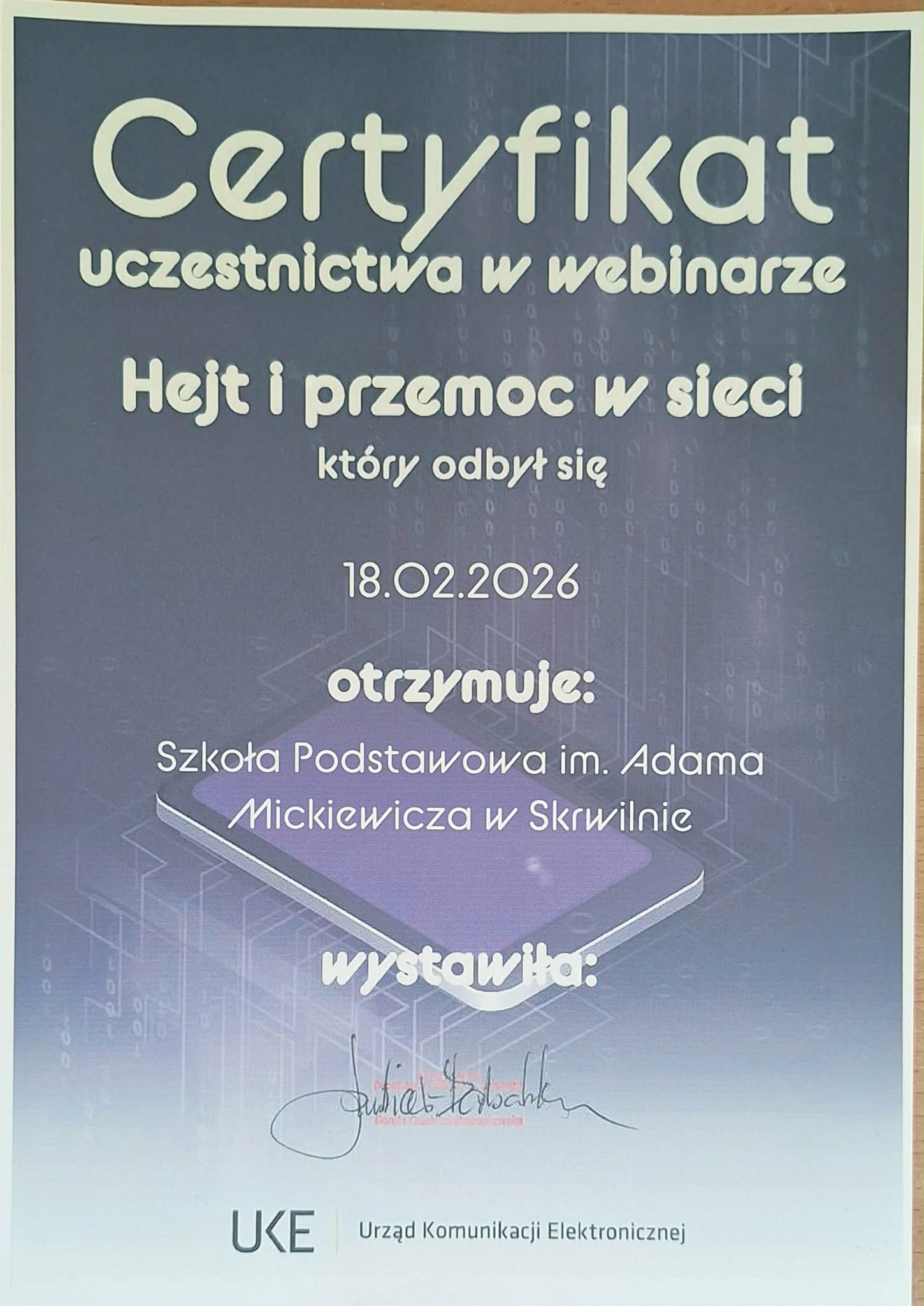 W dniach 18 i 25 lutego nasza szkoła wzięła udział w webinarze pt. „Hejt i przemoc w sieci”, organizowanym przez Centrum Informacji Konsumenckiej Urzędu Komunikacji Elektronicznej, przeznaczonym dla uczniów klas I–III, IV–VI oraz VII–VIII.
